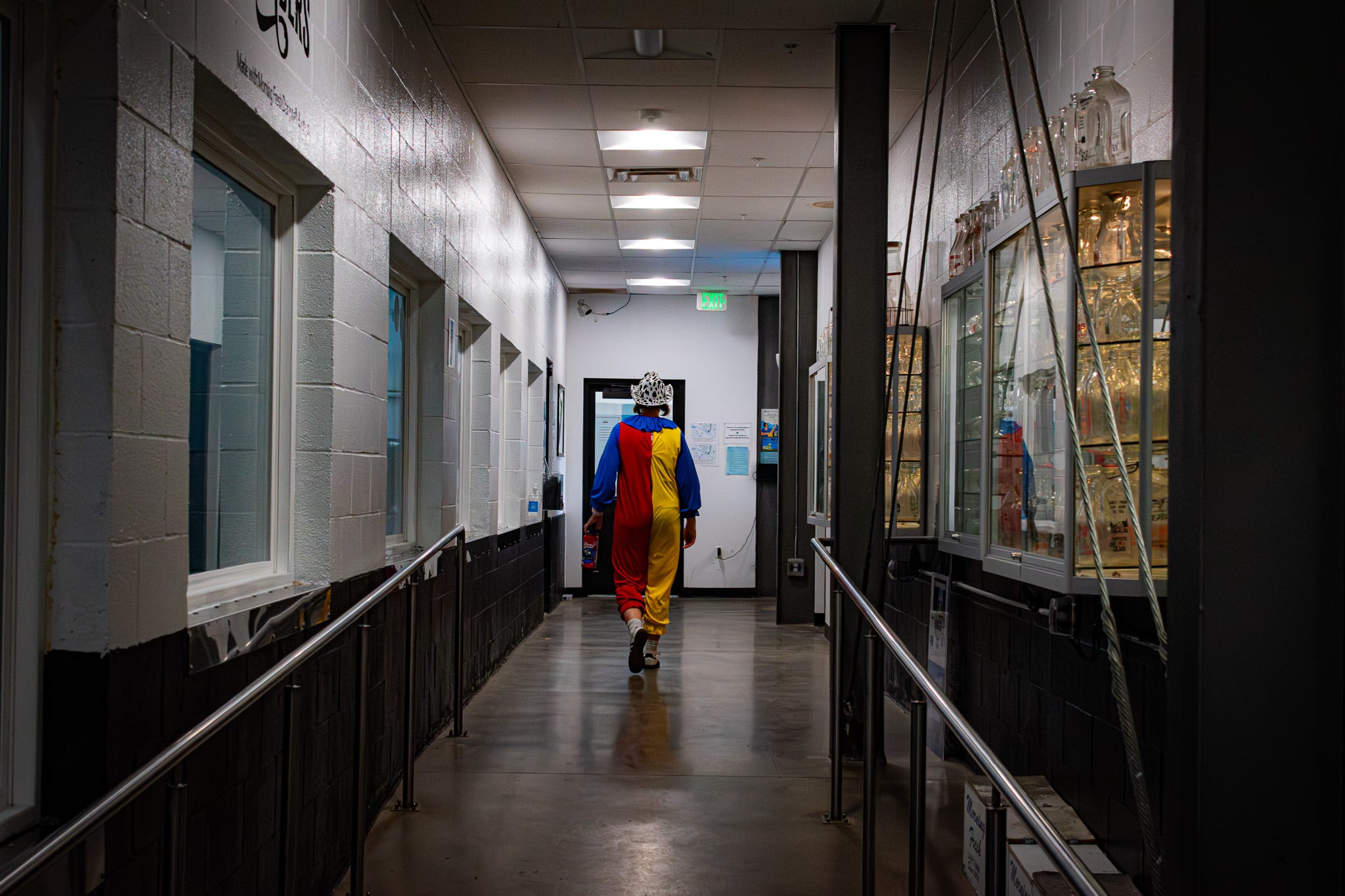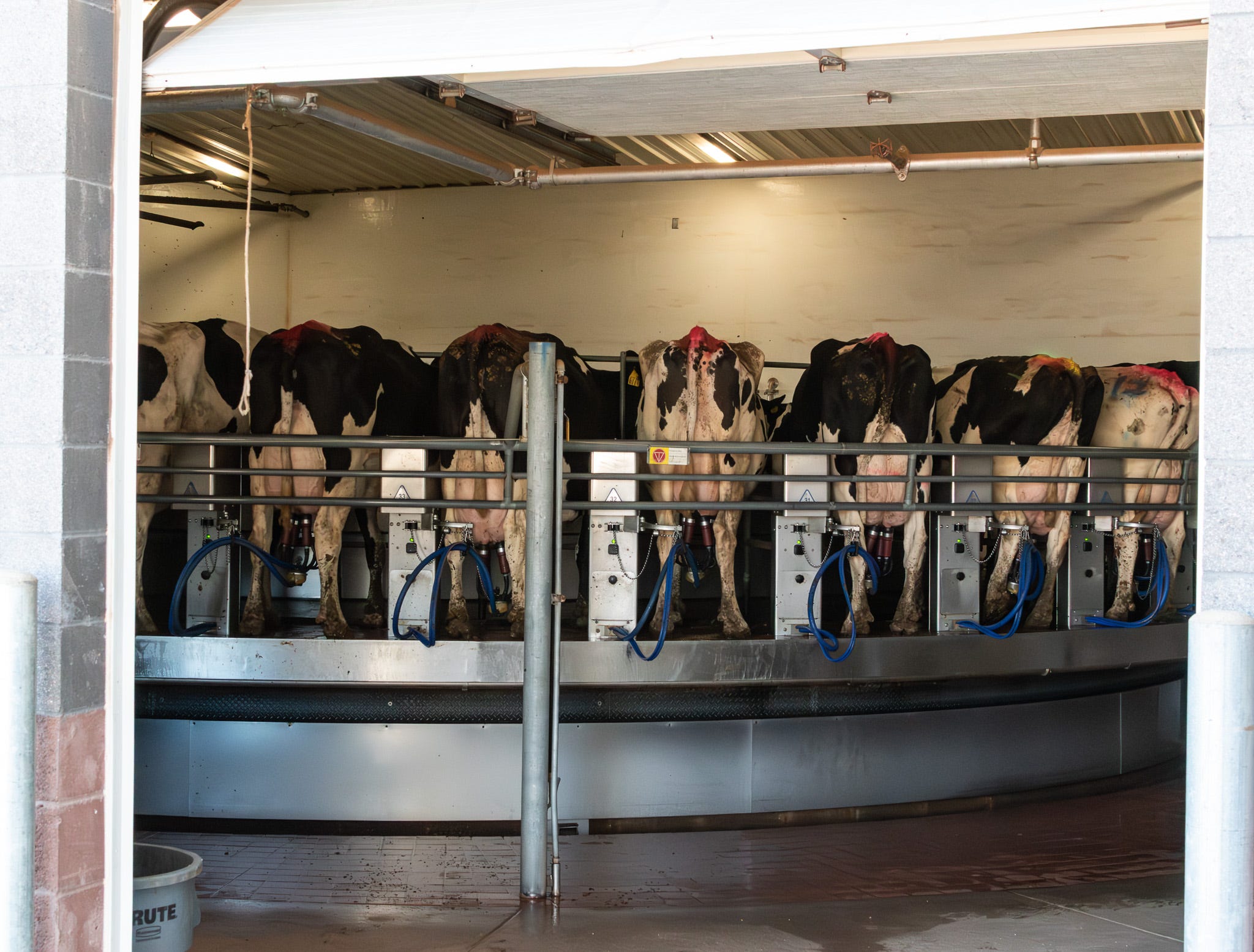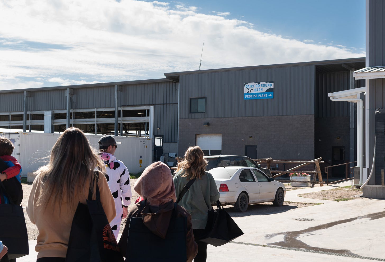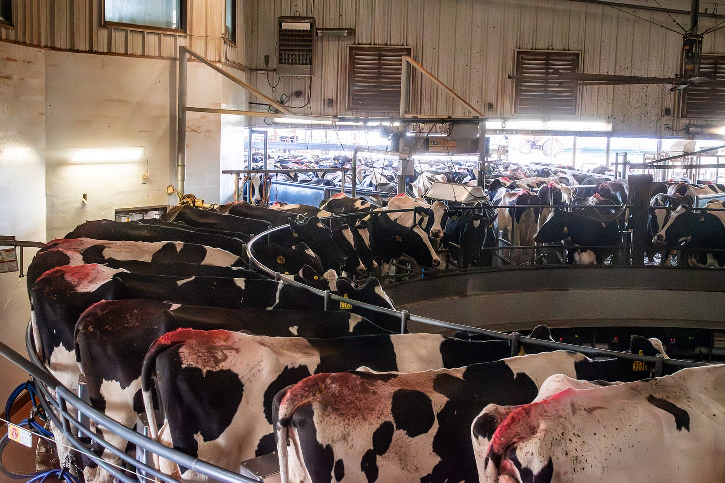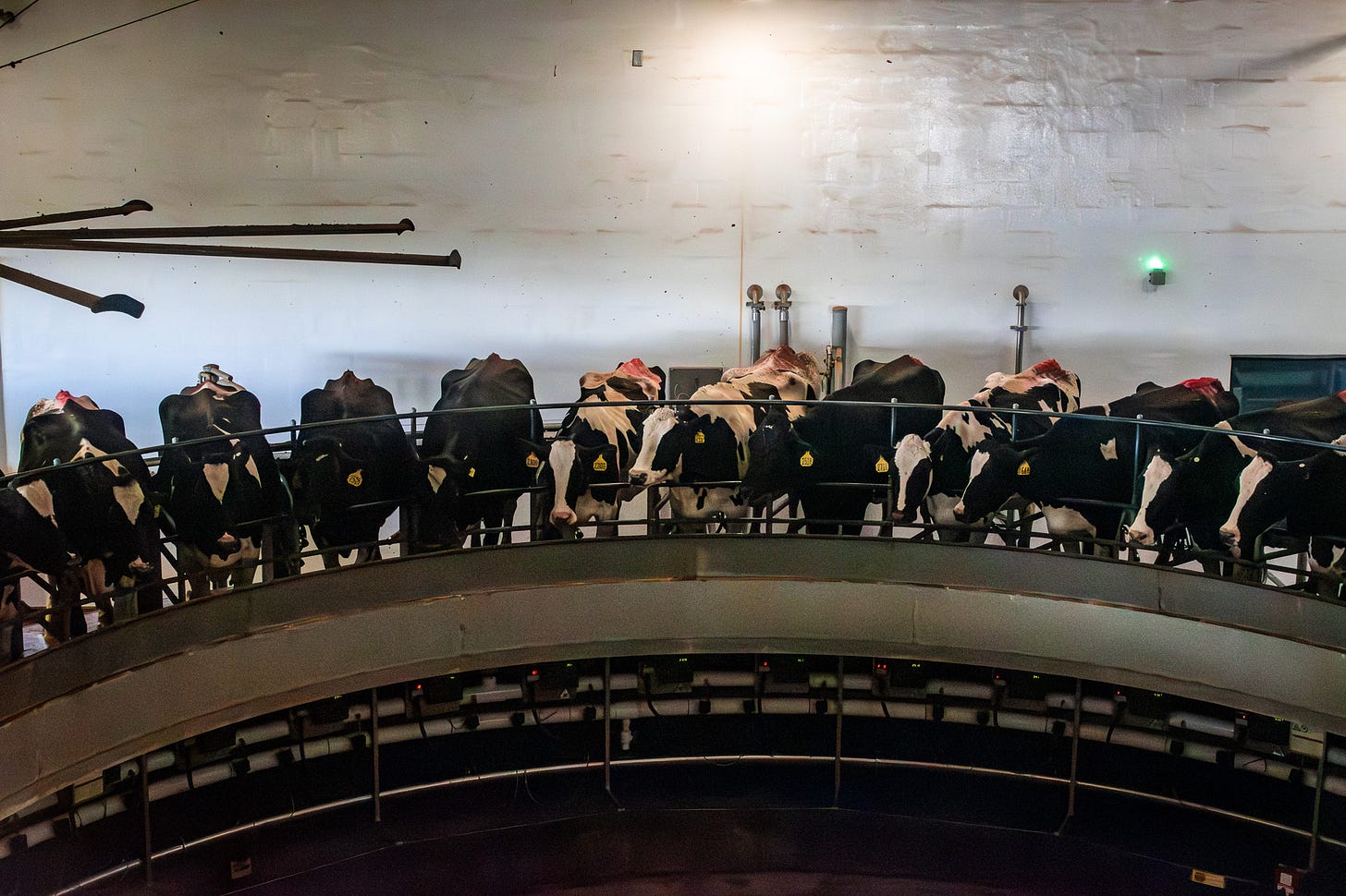 I am standing in a room overlooking the “dairy-go-round” while a man in a cow costume explains the scene below. Children eat their Halloween candy as if this is all completely normal. I lock eyes with one of the cows just before she enters the chute, where milking equipment will be attached to her body. The platform turns, and she’ll go around and around with the rest of them.